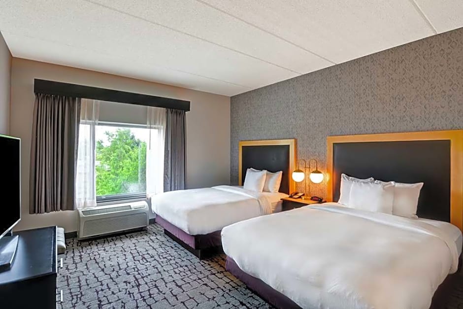 Complimentary WiFi access, large desk with ergonomic chair, two 32-inch flat-screen TVs. Enjoy your stay in this stylish guest room, equipped with two Sweet Dreams® by DoubleTree signature queen-sized beds. Sit back on the sofa and watch one of the two 32-inch LCD TVs, featuring 70 channels, or surf the web using our complimentary WiFi. Make use of the desk and ergonomic chair to get some work done in comfort during your stay. Other amenities in this room include a microwave, mini-refrigerator, coffeemaker, bathrobe and daily newspaper delivery.